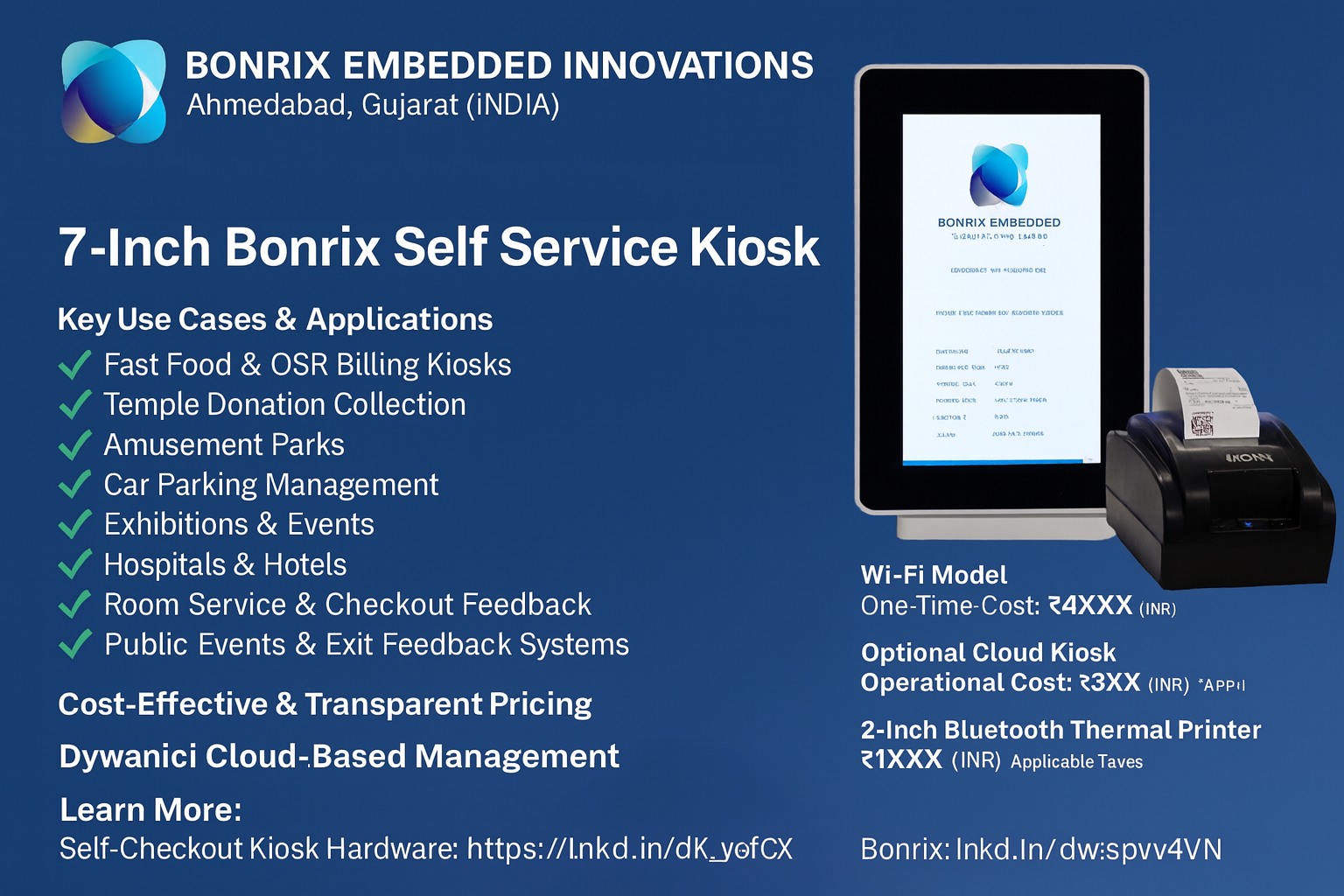 Bonrix 7-Inch Self Service Kiosk – Smart Cloud-Managed Solution for Billing, Donations, Ticketing and BHIM UPI Payments